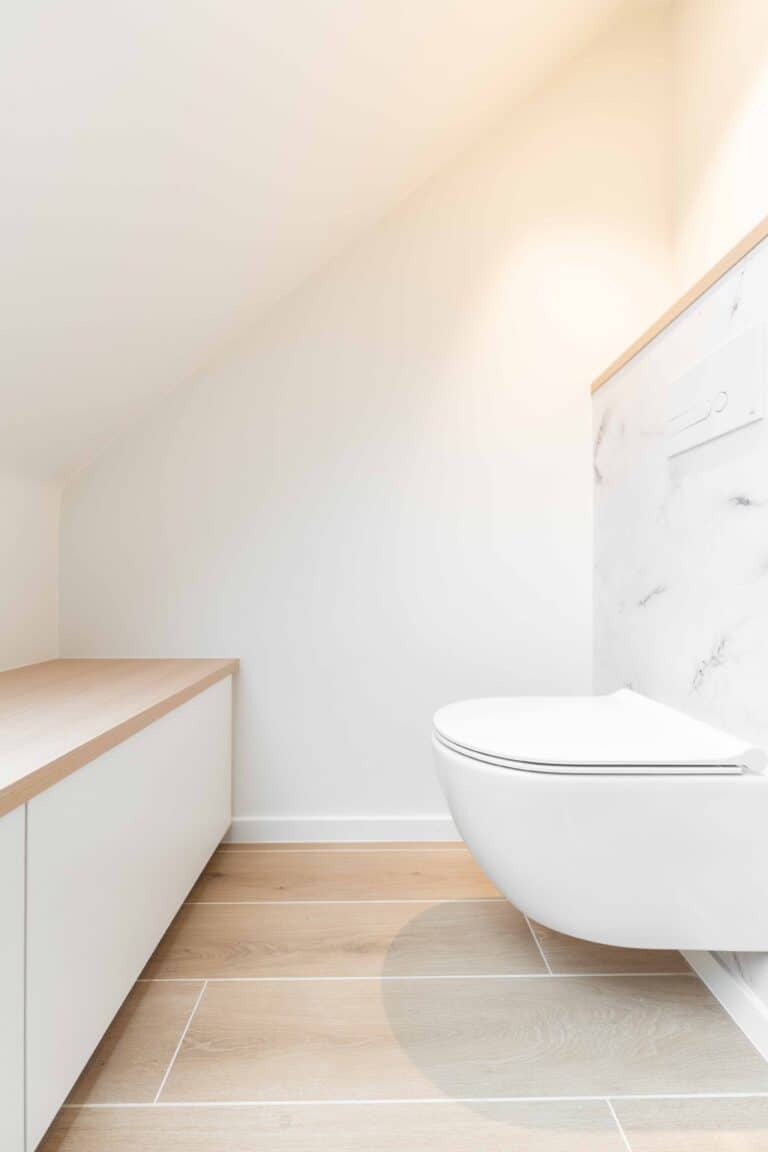 In de nieuwe badkamer werd een extra muur geplaatst die zorgt voor een logische opdeling in verschillende functies. Aan de linkerkant van deze nieuwe wand bevindt zich het toilet, discreet weggewerkt achter de muur. Aan de andere zijde werd een comfortabele douche geïntegreerd, wat zorgt voor meer privacy en een rustigere beleving van de ruimte.