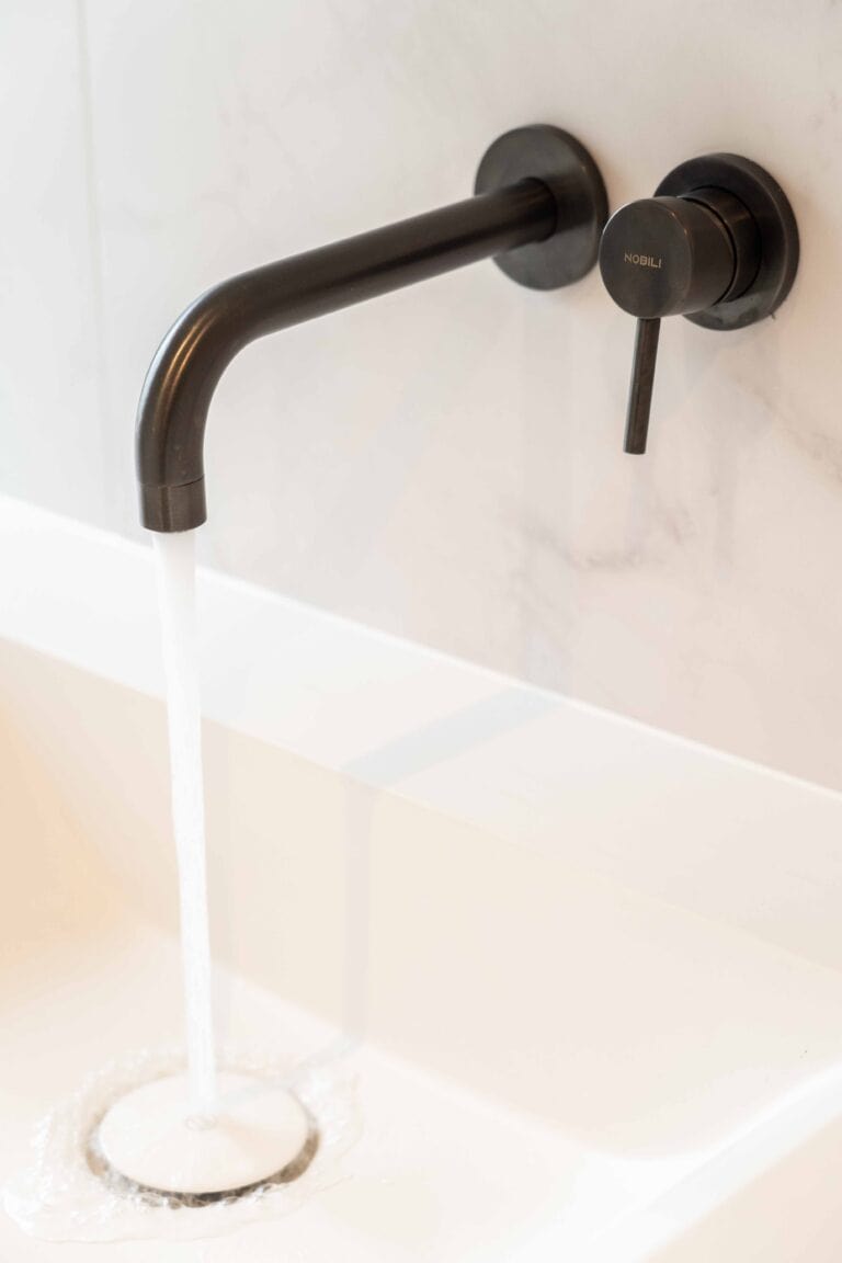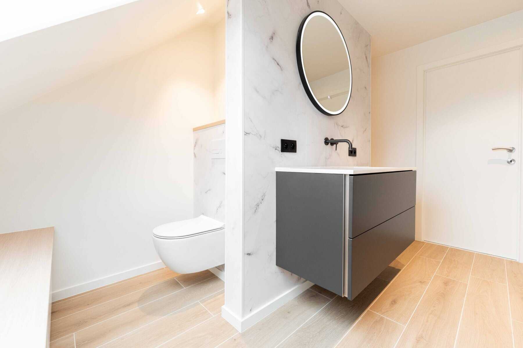 Bij de afwerking werd bewust gekozen voor materialen die aansluiten bij actuele interieurtrends. De marmerlook wandafwerking speelt hierin een centrale rol en geeft de badkamer een luxueuze, tijdloze uitstraling.